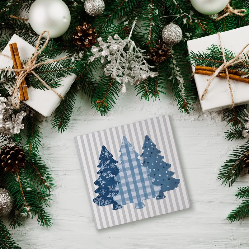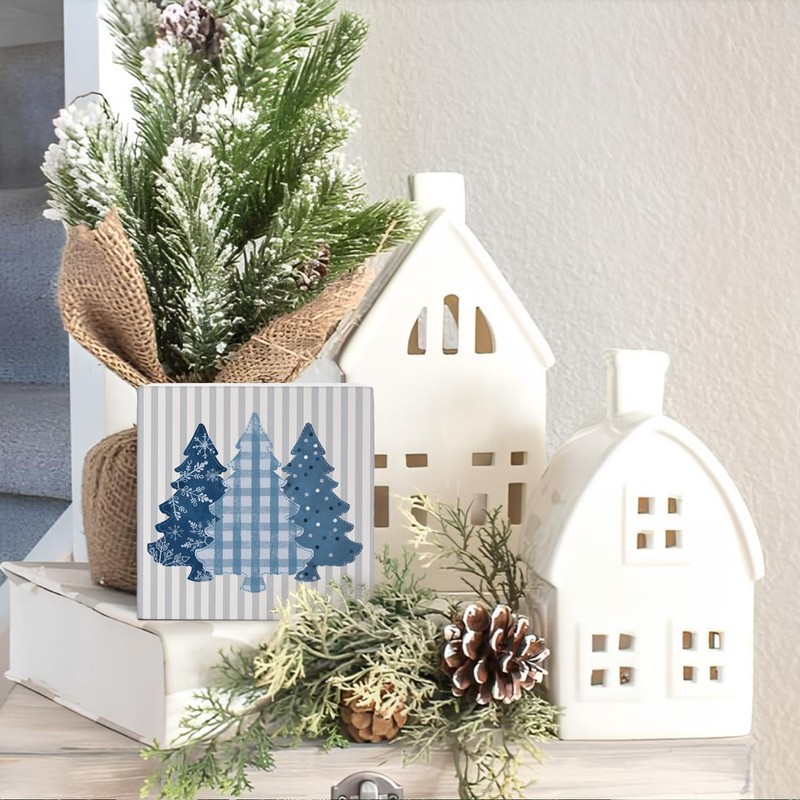 FLVGE Winter Christmas Trees - Rustic Blue Wooden Box Sign Decor, Indoor Home Shelf Desk Decor 5x5