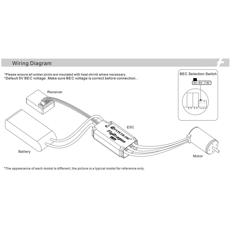 - Function: Using C8051F850 MCU, pipelined 8-bit C8051 core . FlyDragon Lite series, unique circuit design, Built-in 5V/6V/7.4V, 5A adjustable BEC, it can be selected by switch according requirement (Default 5V. Make sure BEC voltage is correct before connection.).