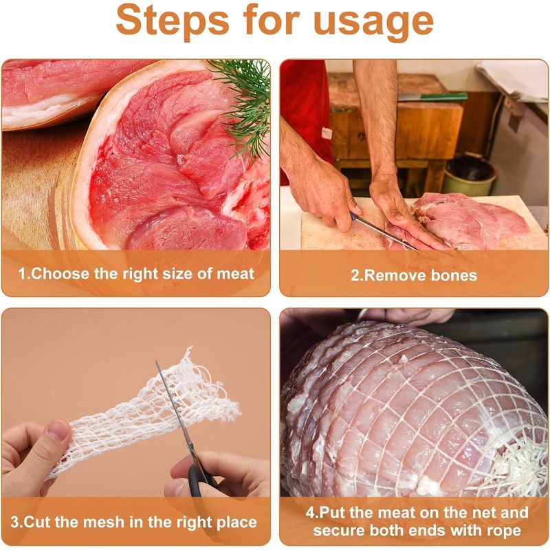 - Easy to use: our ham nets are stretchy and strong, and their sleeves are designed to easily fill with meat and hold the pieces of meat securely in place, so they can be easily cut and removed cleanly after cooking to get clean pieces of meat.