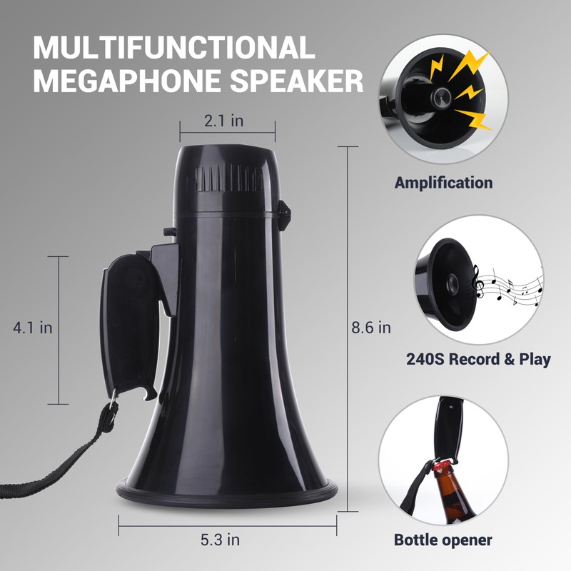 - 240S Recording and Replay: Featuring a built-in 240-second recording and replay function, this bull horn loud speaker allows you to save your voice and replay your message whenever needed, ensuring your message is heard clearly and repeatedly.