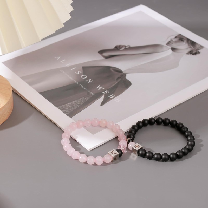 FLYEMMET Couple Bracelets for Women Men Distance Matching Relationship 8mm 10mm Stone Beads Couples Friendship Stretch Bracelet Jewelry Set for Him and Her (Sun Black & Moon Pink)