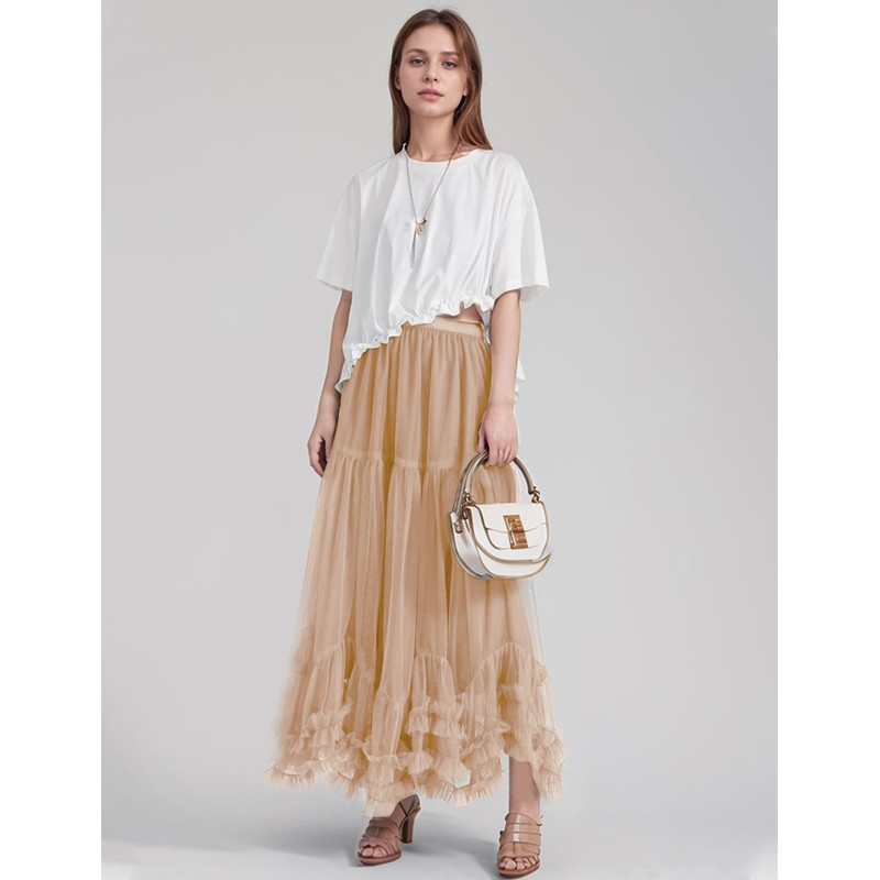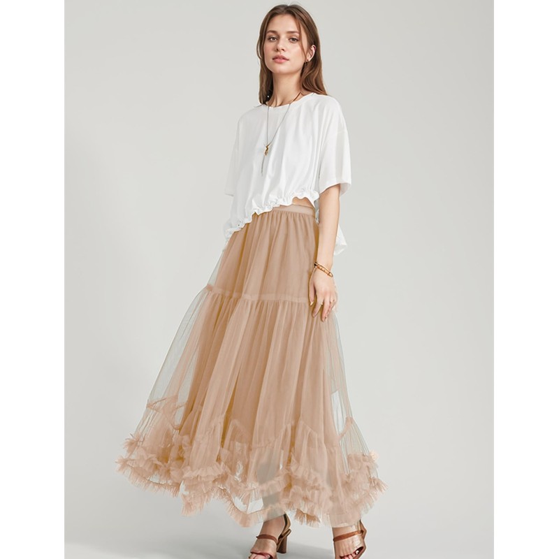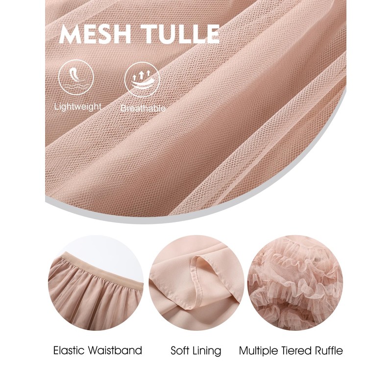 - Stylish Tiered Skirt: This women's tulle skirt is crafted with two layers of sheer mesh and a smooth satin lining for a luxurious feel. The hem showcases a tiered "cake" silhouette with delicate ruffled edges, creating a soft, elegant flow with every step or twirl