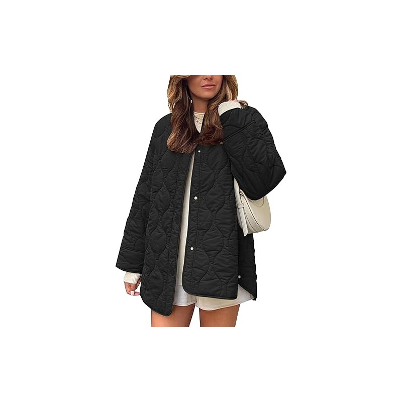 - Spring Jackets for Women Feature: Cotton-padded light puffer jacket, crewneck, collarless design, snap buttons closure, well-measured seam work, two functional side pockets, long sleeve womens jackets, slit curved hem, loose fit, solid color, relaxed fit quilted jacket. Size S=US(6-8), M=US(10-12), L=US(14-16), XL=US(18-20). If you want a more casual look, go a size smaller