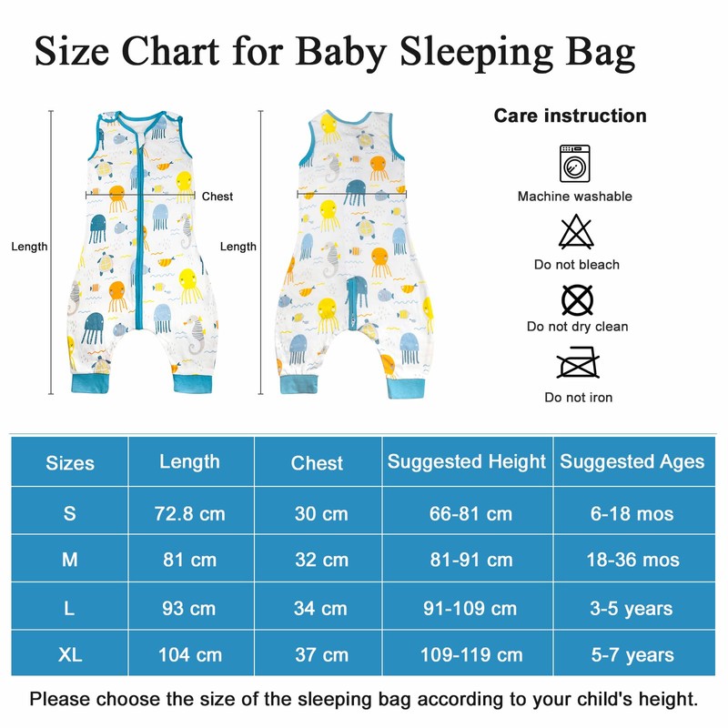 • Sizes for choice: three sizes can choose from. Sleeping bag S suitable for babies from 66-81 cm 9-18 months, sleeping bag M suitable for babies from 81-92 cm 18-36 months, sleeping bag L suitable for babies from 91-109 cm 3-5 years. The sleeping bag can be machine washed.