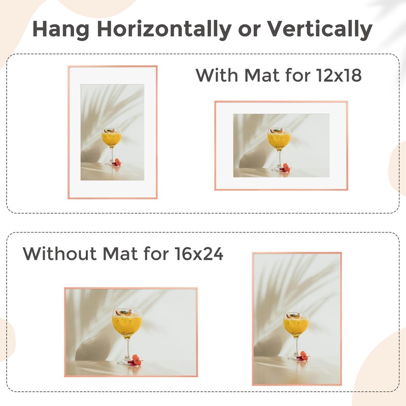 - Flexible Mat Size: Fit any photo you want with our flexible mat size! Display an 16x24 photo or use the mat to fit a 12x18 photo. The display size is 11.5x17.5 with the mat and 15.5x23.5 without it, giving you complete flexibility to display your photos your way. With hanging hardware and easy clip fasteners, you can customize the display of your photos to fit your space and style