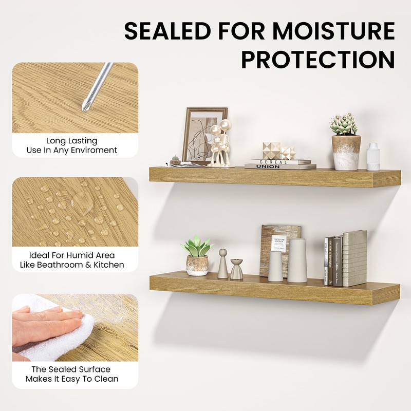 - Rustic Charm Meets Modern Style: Crafted from durable engineered wood and finished with a lifelike PVC wood grain, these floating shelves blend cozy warmth with sleek minimalism. Their clean, thick silhouette adds a touch of modern elegance, while the rich wood tones enhance any space with depth and character