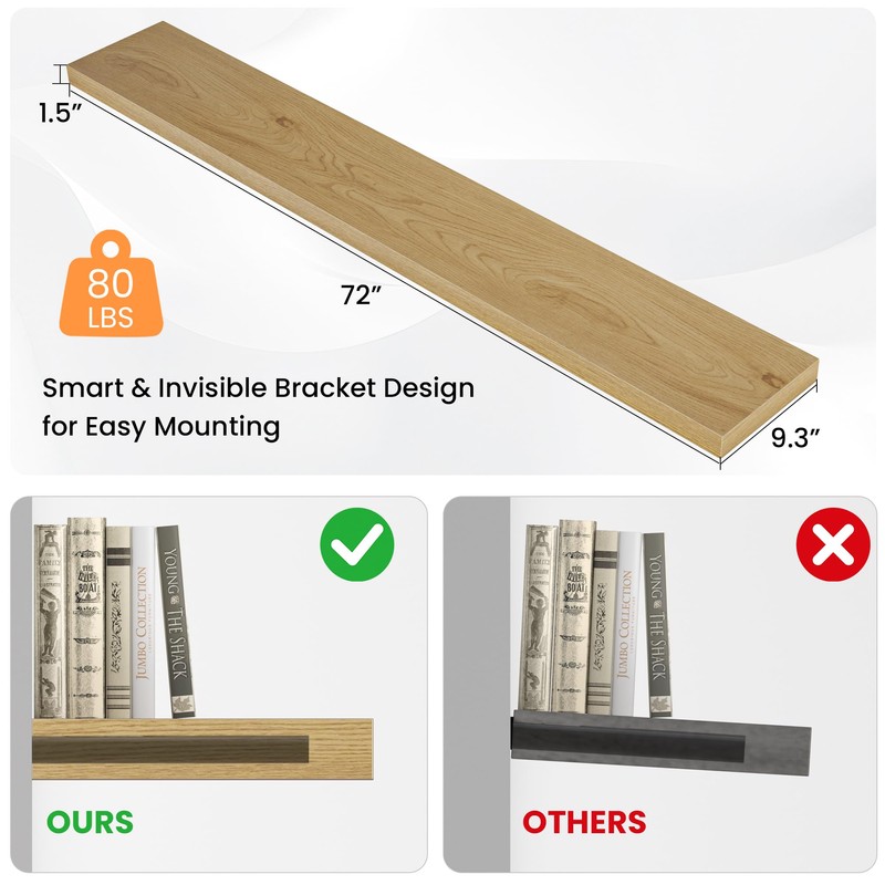 - Heavy Duty Floating Shelves: Measuring 72 inches long, 9.3 inches deep, and 1.5 inches thick, our floating wood shelf offers reliable strength and lasting stability. Its solid construction easily supports heavier items such as books, framed art, or small potted plants. Designed for both function and durability, it’s a dependable storage and display solution for any room—whether it’s the kitchen, office, living room, or bedroom