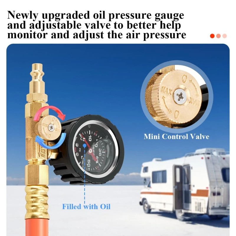 Time-saving Reduces Effort: The RV blow out plug adapter comes with a pressure gauge and adjustable shut-off valve to accurately monitor and control pressure, making it extremely convenient to winterize your camper and sprinkler system