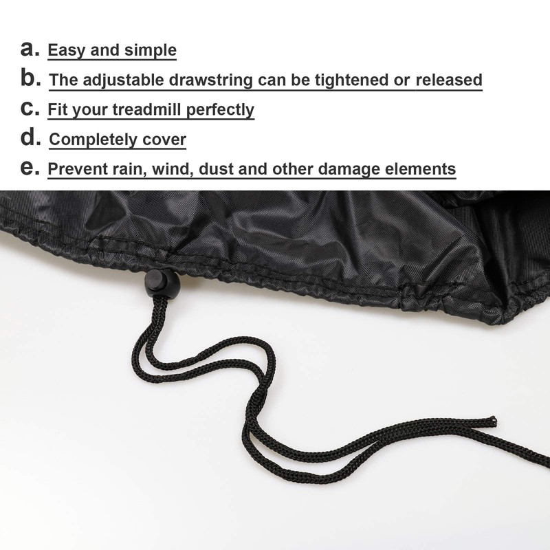 - UNIVERSAL DESIGN COVER WITH ADJUSTABLE DRAWSTRING The universal design cover is simple and simple, the adjustable drawstring can be tightened or loosened, then the device cover can fit your device more. And tighten the drawstring completely, your treadmill will be fully covered and prevent rain, wind, dust and other damage.