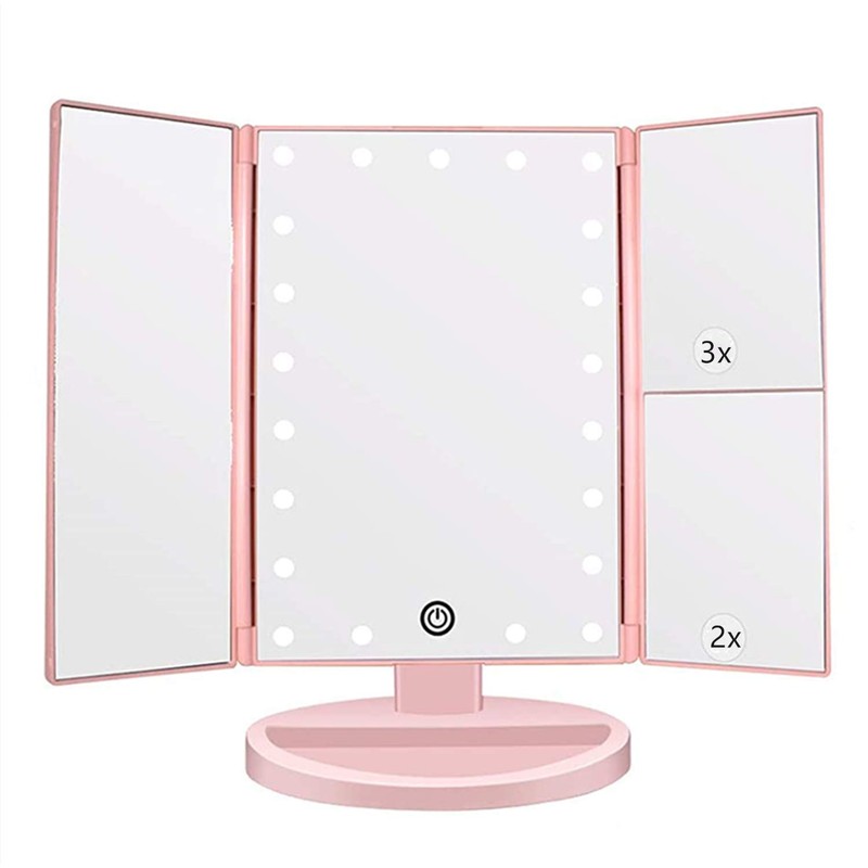 Flymiro Tri-fold Lighted Vanity Makeup Mirror with 3x/2x Magnification,21 LEDs Light and Touch Screen,180 Degree Free Rotation Countertop Cosmetic Mirror,Travel Makeup Mirror(Pink)