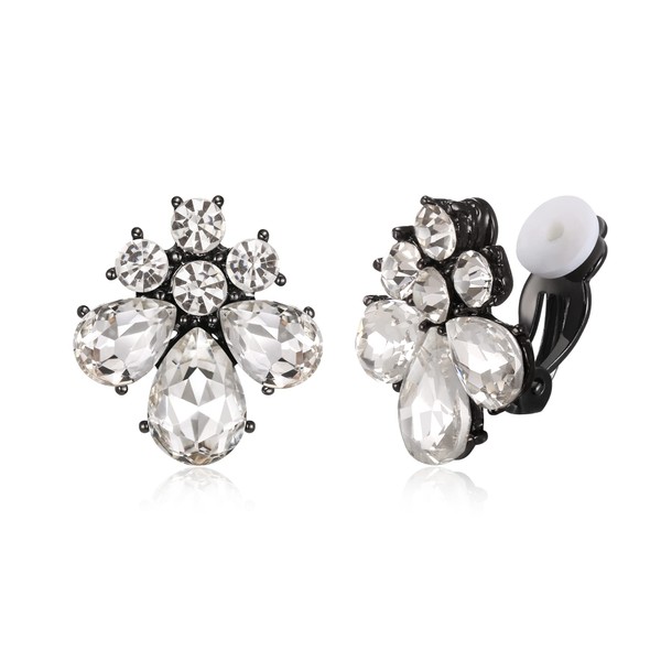 Flyonce Teardrop Clip-on Earrings for Women Wedding Bridal, Rhinestone Crystal Flower Clip On Stud Earrings Clear Black-Tone