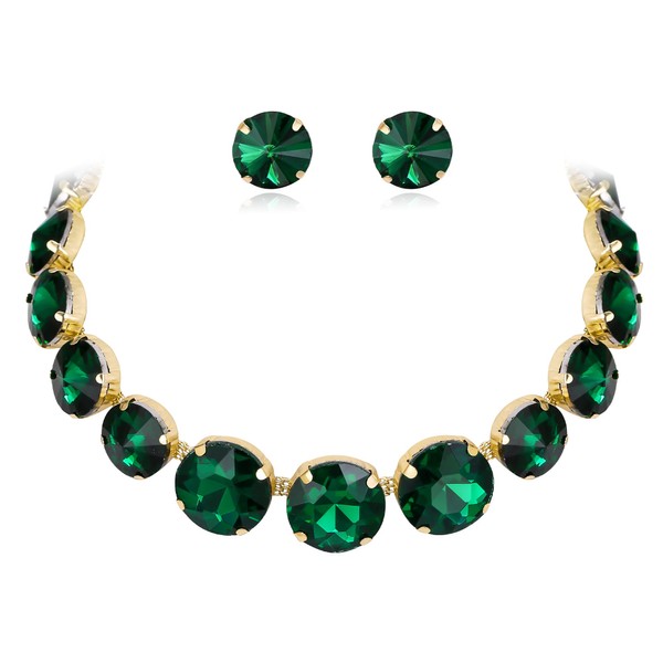 Flyonce Women's Crystal Necklace and Earrings, Round Rhinestone Choker with Stud Green Crytal Wedding Party Statement Jewelry Sets