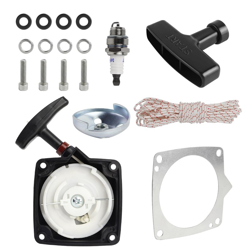 - Package Includes:1 X Pull starter, 4 X Screw, 8 X Gasket, 1 X 10meter Starter Pull Cord Rope, 1 x Pull Start Handle, 1 X Spark plug