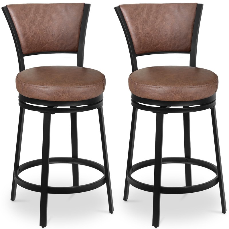 FLYZC Bar Stools, Counter Height Barstools Set of 2, 25" Faux Leather Metal Round Swivel Bar Chairs with Back, Modern Upholstered Counter Stools for Kitchen Island, Brown
