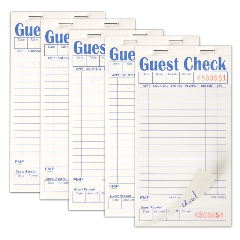 FMP Brands Guest Check Books for Servers, Server Note Pads Paper, Total 250 Sheets (5 Pads), White with Guest Receipt, Guest Check Pads, Restaurant Order Pads, Waitress Notepads