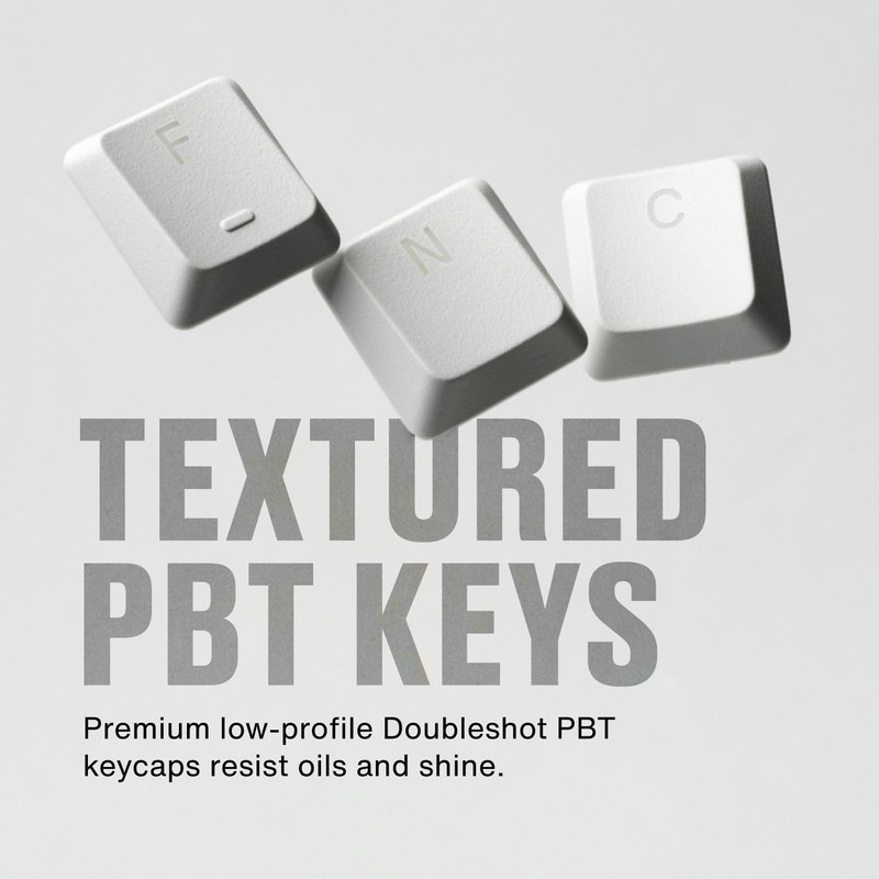 - TEXTURED PBT KEYS - Premium low-profile Doubleshot PBT keycaps resist oils and shine.
