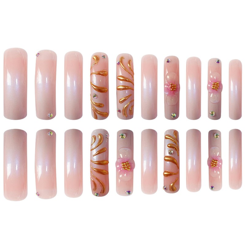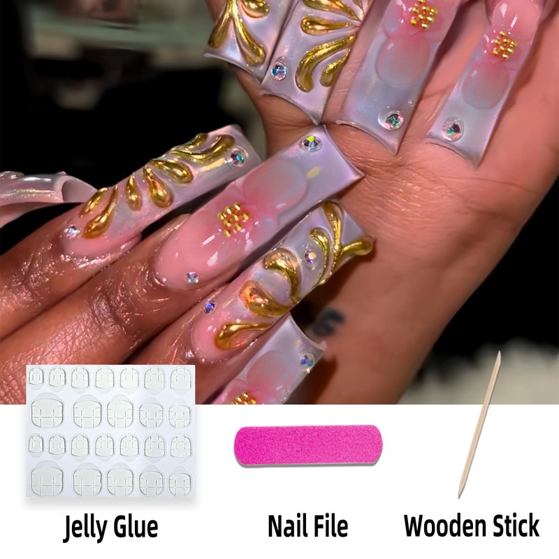 - High-Quality Press on Nail Kit: These 3d embossed gold line acrylic nail presses are made of high-quality materials, lightweight and comfortable to wear, and have no pressure on the nail bed. Perfectly fitting the nail bed, it feels like real nails. And it doesn't harm the nails, sensitive nails can also be used comfortably