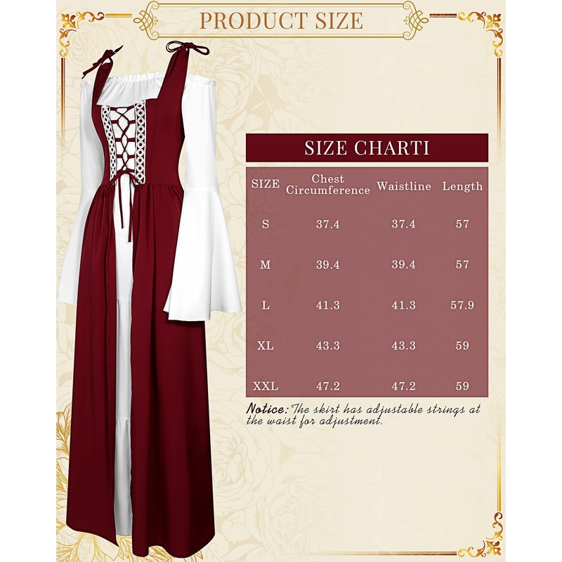 - Vintage Style for Women: the inner part of the medieval dress is an elegant white inner dress with long sleeves and elastic neckline, and the outer part is a stylish halter neck vest dress; The dress has straps that can be adjusted to show your figure well, retro and elegant, enough to attract others' eyes