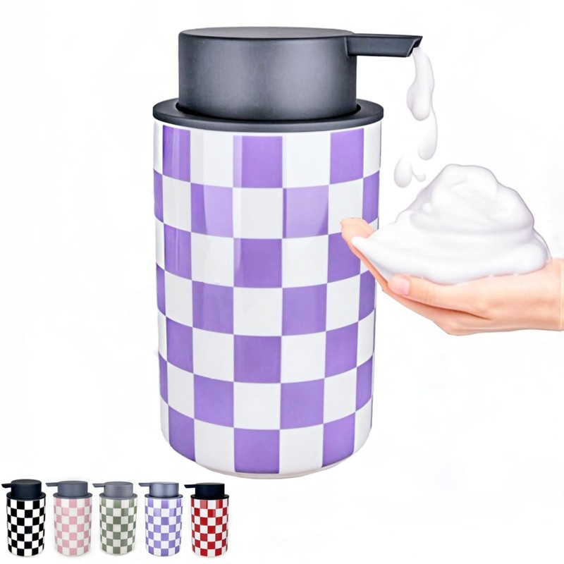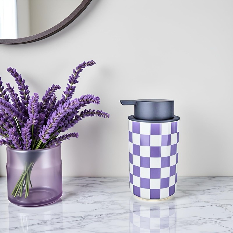 - Modern Lavender purple checkered design-This foam hand soap dispenser features a sleek lavender purple checkered pattern, combining clean lines with a contemporary aesthetic. The minimalist design offers both functional convenience and visual appeal, making it a practical addition to kitchen or bathroom countertops. Its smooth, foaming pump ensures reliable dispensing, while the modern checkerboard motif adds a subtle, stylish touch to any space—perfect for those seeking understated elegance in everyday essentials.