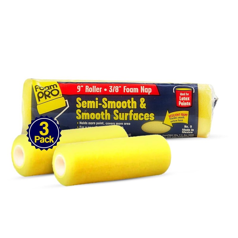FoamPro 9 Paint Roller Cover for Smooth & Semi-Smooth Surfaces| High Capacity Foam Roller Cover | House Painting Supplies | 9” x 3/8" | 3-Pack