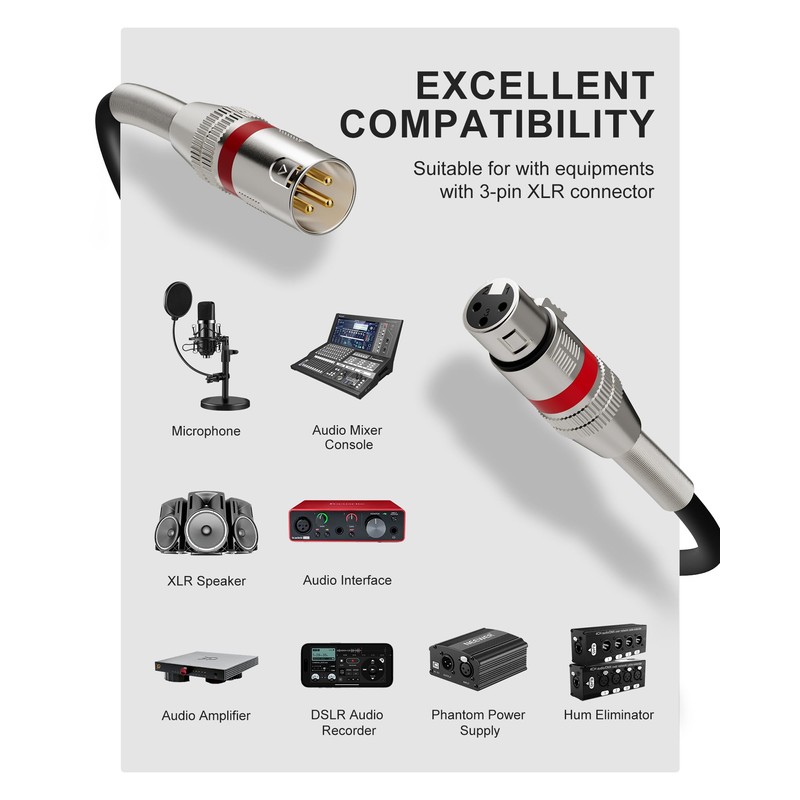 This professional standard XLR male to female microphone cable is compatible with equipment that has 3-pin connectors, such as microphones, preamps, studio harmonizers, phantom power, mixing boards, patch bays, speaker systems, and stage lighting.