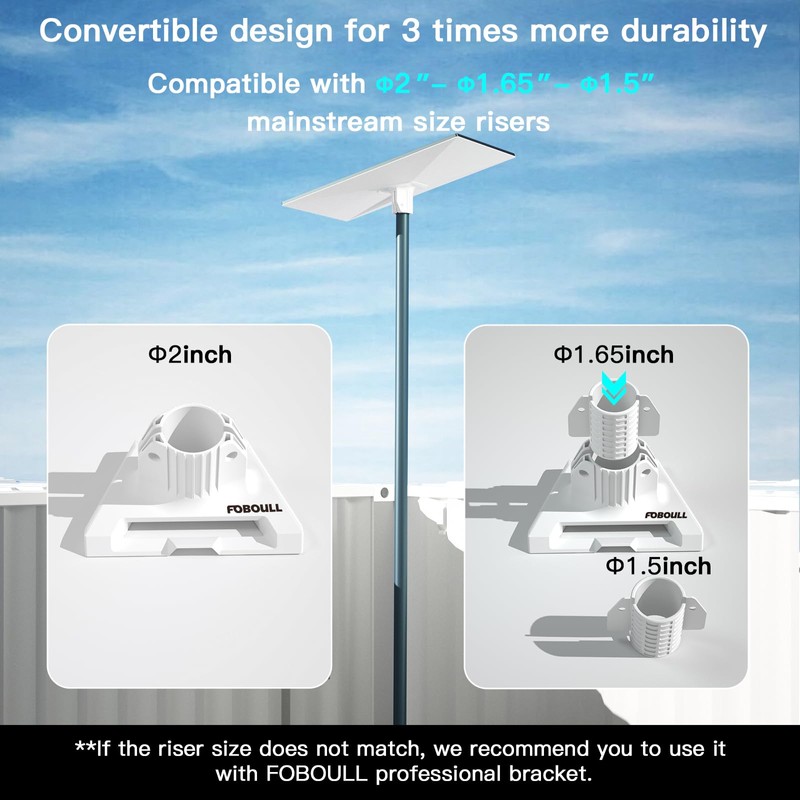- Featuring a convertible design: Seamlessly compatible with 2-inch, 1.65-inch, and 1.5-inch mainstream riser sizes, allowing the adapter to securely attach to poles or pipes.