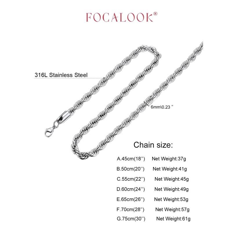 FOCALOOK Twisted Chain Stainless Steel 55cm Necklace Mens Link Chain 6mm Rapper Necklace Stainless Steel, Stainless Steel