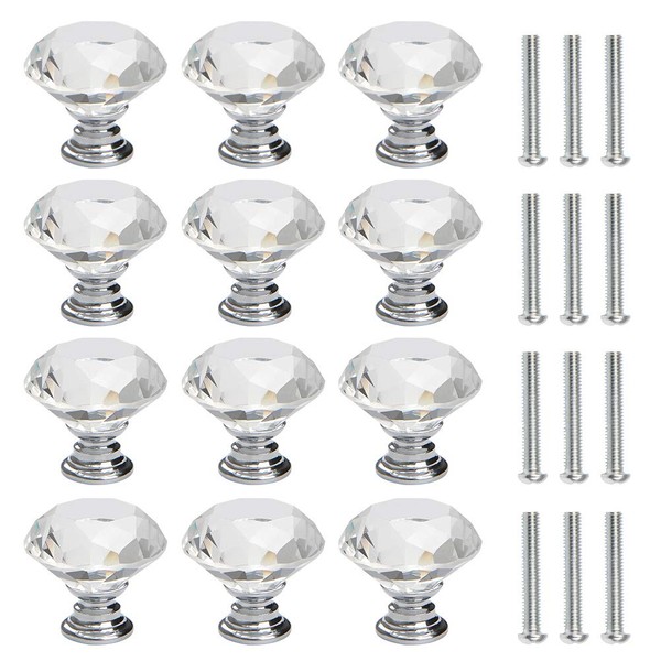 FOCCTS 12 PCS 30mm Crystal Door Knobs Glass Drawer Knobs Decorative Crystal Door Handles Diamond Pulls with Screws for Home Office Chest Cabinet Drawers
