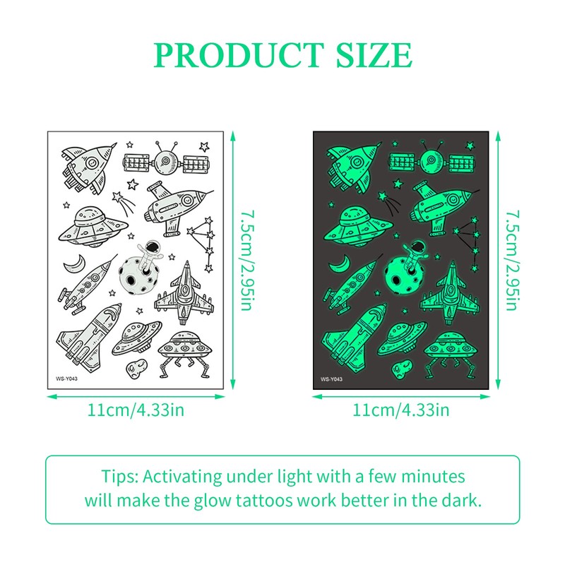 - Luminous Space Tattoos: 10 Sheets tattoo include cosmos, rocket, UFO, astronaut, earth, meteor and so on patterns, which will raise children’s interest in outer space.