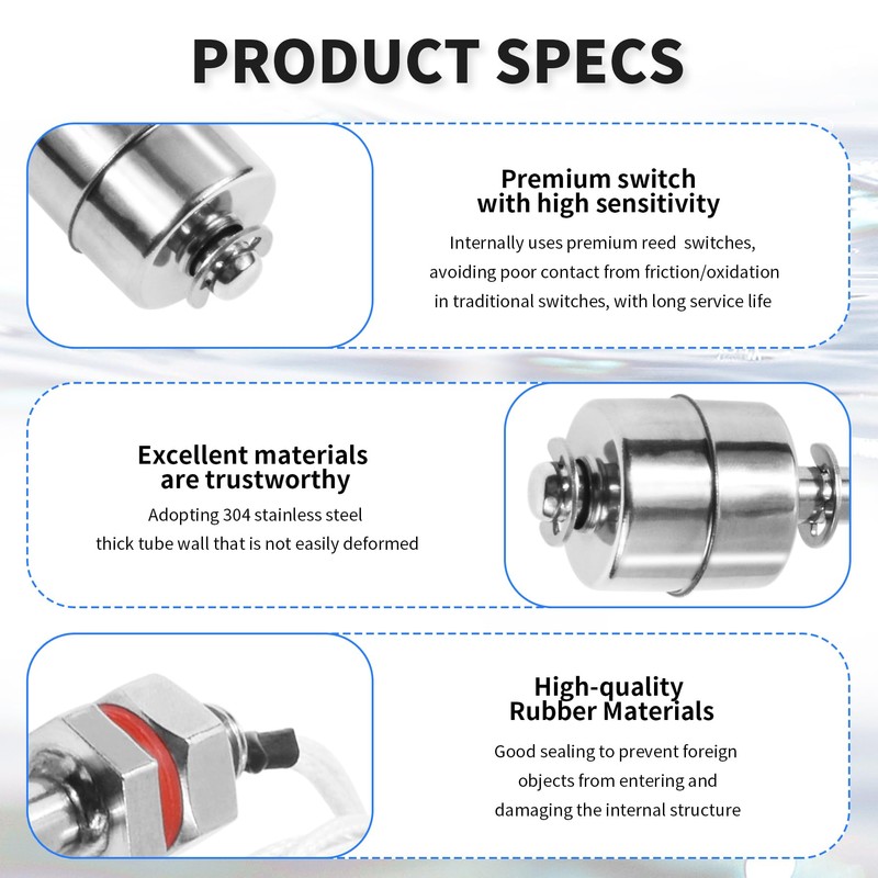 - Convenient and flexible:Flip the float 180° to switch between Normally Open (NO) and Normally Closed (NC) modes,mount at tank top (detect rising) or bottom (detect falling)