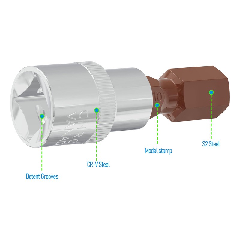 Four detent grooves in the socket drive end provide a secure connection with spring-loaded detent balls of a drive tool, ensures the sockets won't slide or drop.