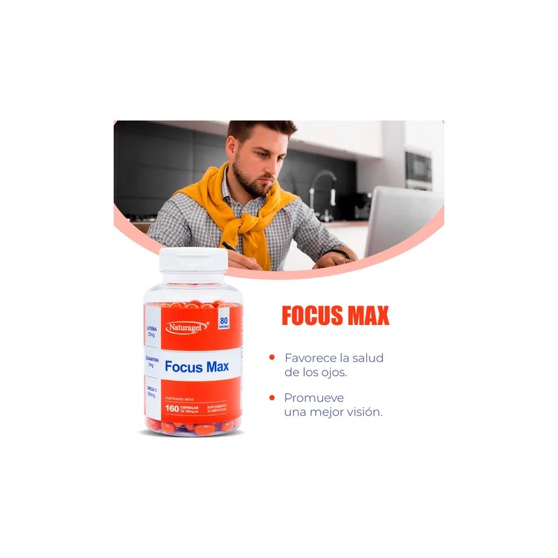 Optimiza tu concentración y protege tu visión con FOCUS MAX de Naturagel. Este suplemento avanzado combina Luteína y Zeaxantina, potentes antioxidantes que protegen los ojos de la luz azul y el envejecimiento celular, con Omega 3 (EPA & DHA), esencial para el funcionamiento cerebral y el enfoque mental.