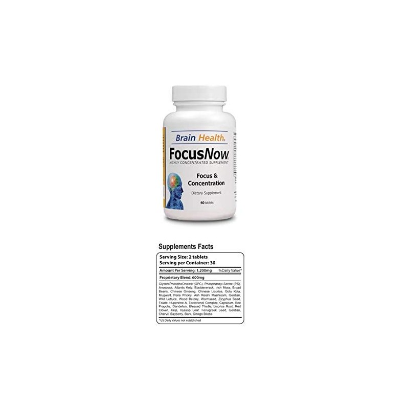 Focus Now Supports a healthy level of memory, concentration and focus. Includes ingredients such as Ginkgo Biloba, Broad Beans, Red Clover, Fenugreek, Irish Moss, and Ginseng, for which studies have shown to be effective as a cognitive tonic.