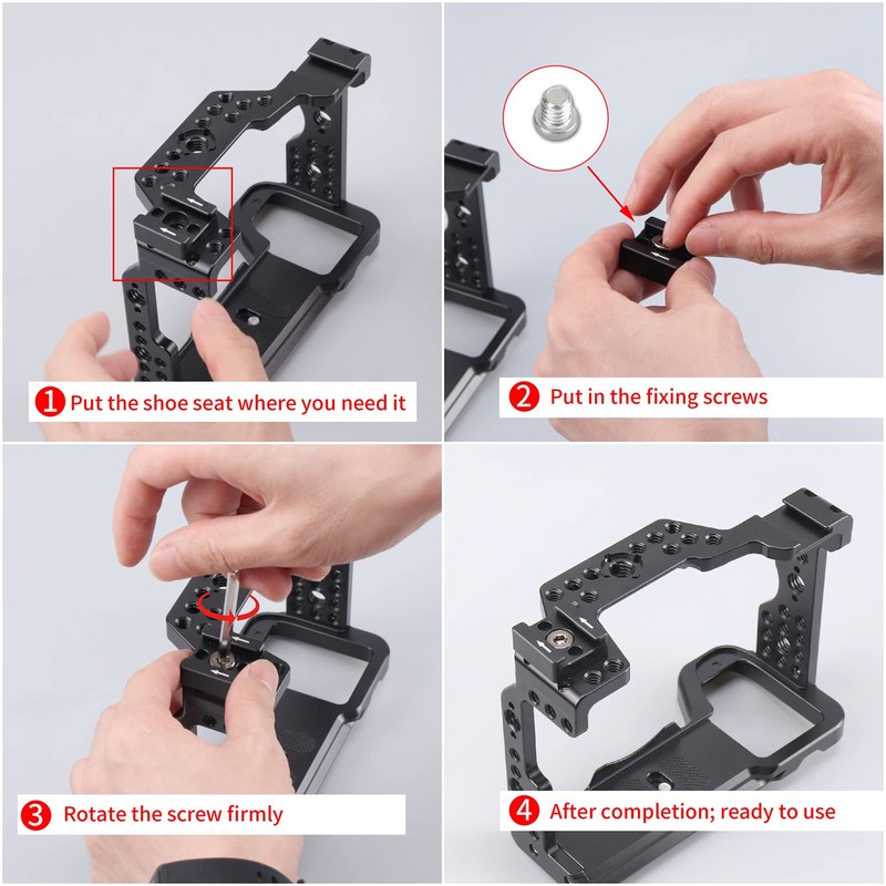 The cold shoe adapter is made of aluminum alloy for light weight and durability, and could be directly attached to any 1/4"-20 threaded hole via 1/4"-20 screw. It accepts any standard shoe mount acessory such as on-camera light, flash, microphone mount, evf mount and more.