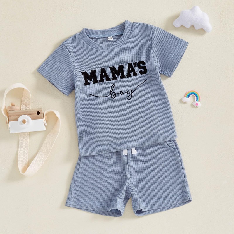 FOCUSNORM Toddler Baby Boy Summer Clothes Embroidered Waffle Short Sleeve T-Shirts Elastic Shorts Newborn Infant Boy Outfits (Mamas Boy Blue, 12-18 Months)