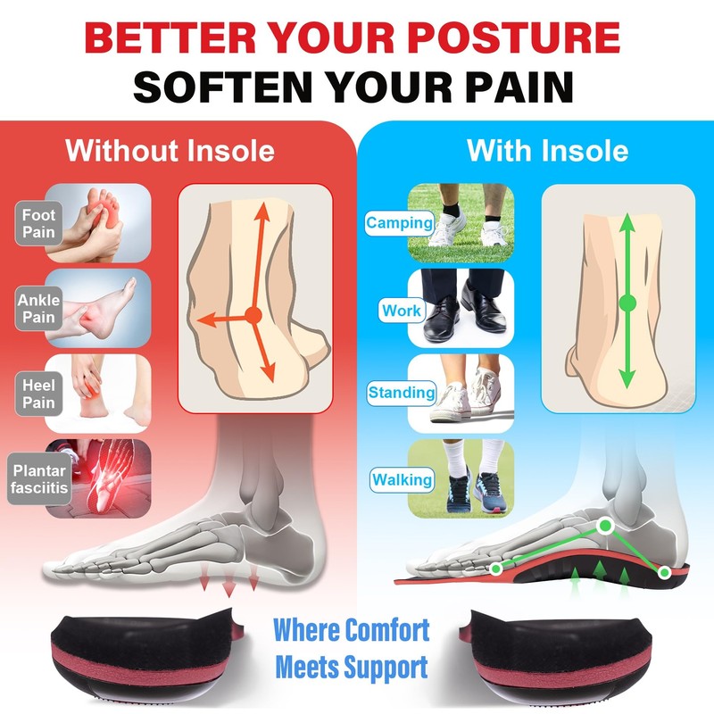 - FITS MOST TYPES OF SHOES: Orthotic shoe inserts can be used in work boots, casual shoes, hiking shoes, sneakers, skates, tennis shoes, and more.No matter your footwear of choice, our foot support inserts can help relieve your pain from flat feet and plantar fasciitis.