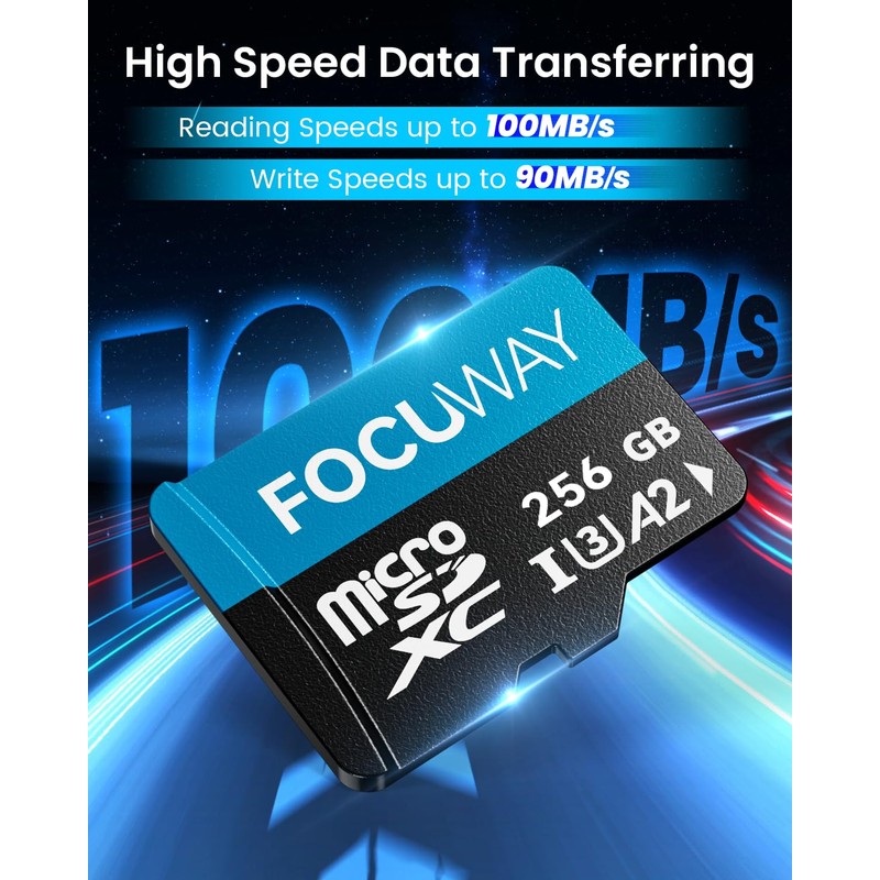 FOCUWAY 256GB microSDXC UHS-I, C10, U3, A2, 4K UHD Video High Speed Transfer Monitoring Industrial Grade SD Card with Adapter for Dash Cams, Action Camera, Surveillance & Security Cams