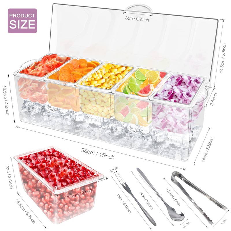 - 【Ingenious Condiment Server Set】The set includes 1pc lidded 5 Compartment Condiment Tray (15.15"L x 5.51"W x 4.92"H), and additionally comes with 2 serving tongs, 5 utility ice scoop, 5 forks, which is a combination of practicality and convenience.