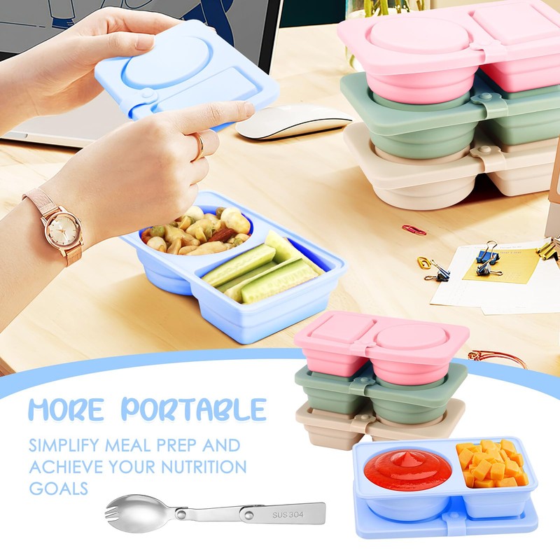 • 2 Compartment Snack Containers: Our silicone snack containers feature two independent compartments, allowing you to store different types of snacks, sauces, seasonings, or even the included folding forks. This design prevents flavor mixing and controls portion sizes, making it easy for you to use