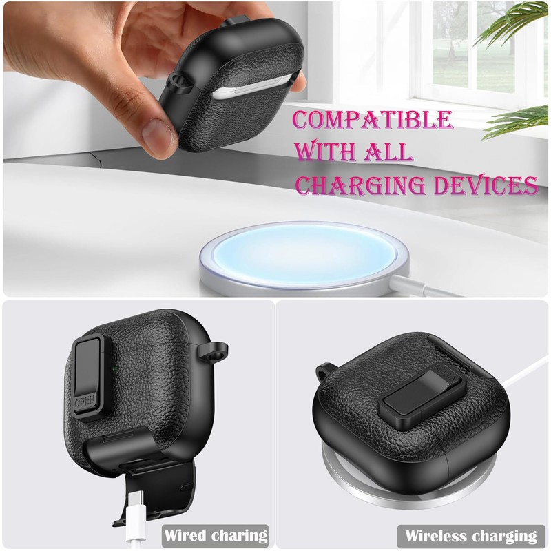 Fofvccv for AirPods 4th Generation Lock Clip Leather Case with Carabiner, Support Wireless Charge with Stand Rugged Protection Cover for AirPods 4, PWJ Black