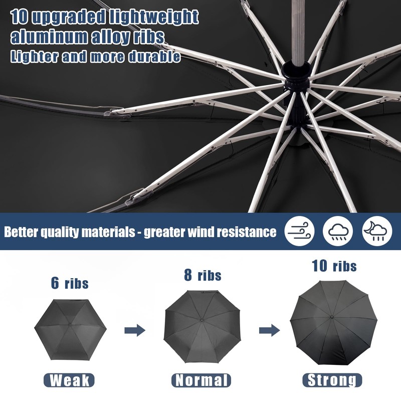 • Windproof ribs: We increased the number of ribs to 10, providing stronger support (windproof). The material of the ribs was upgraded from iron alloy to aluminum alloy, which is lighter and more durable (rust-proof)