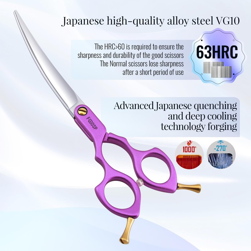 FOGOSP Professional Left Handed Curved Dog Grooming Scissors with Sharper Self Grinding lightweight and finely trimmed split structure 6.5'' Japan VG10 63HRC for small dogs cat pet(Purple)