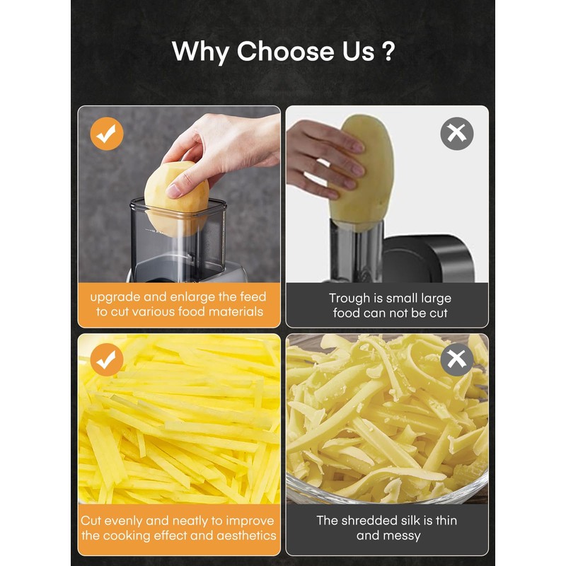 - 【Quick and Easy Slicing】Our cheese grater electric is equipped with a powerful motor and sharp blades, instantly slice, chop, grate, or shred your favorite ingredients. The vegetable slicer can accomplish cutting tasks more quickly, reduce jamming, enhances work efficiency and reduces physical strain, making it particularly suitable for home kitchens, gatherings and events, fast-food restaurants, and sandwich shops.