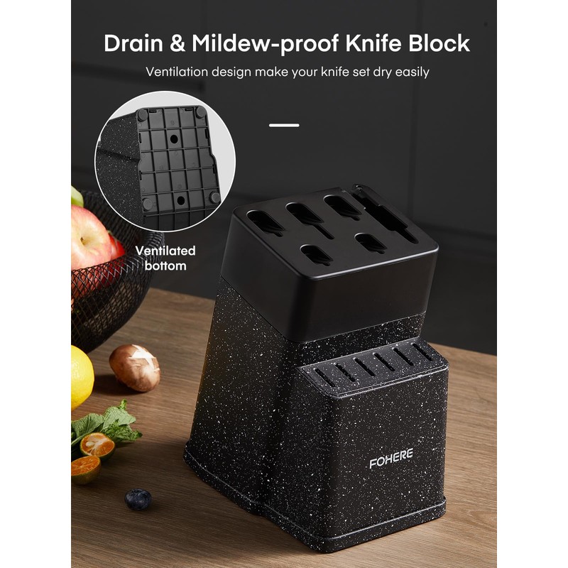 • Convenient Built-in Knife Sharpener: The built-in knife sharpener ensures that you can sharpen your knife at any time. The ventilation design at the bottom of the knife block allows your knives to dry quickly