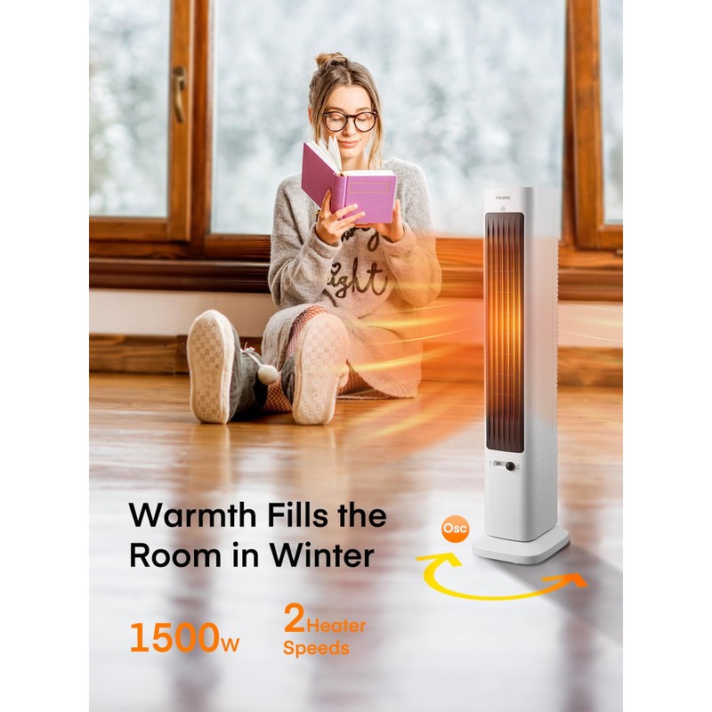- 【2-in-1 Tower Fan and Space Heater for Year-Round Comfort】Just one click to switch between warm and cold modes. The fan mode features 3 speeds and 2 modes (Normal/Sleep Mode), from low to high velocity, delivering brisk cool. The heater mode features 2 speeds and 3 modes (Normal/ECO/Sleep Mode) from low to turbo heat. Feel coolness in summer and embrace warmth in winter.