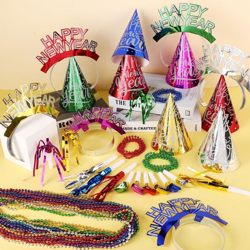 - Reliable to Use: these headbands, cone hats, metallic fringed noise makers, and beaded necklaces are easy to store, and you can use them again and again, which will make the most exciting atmosphere in a complete New Year's Eve party decorations