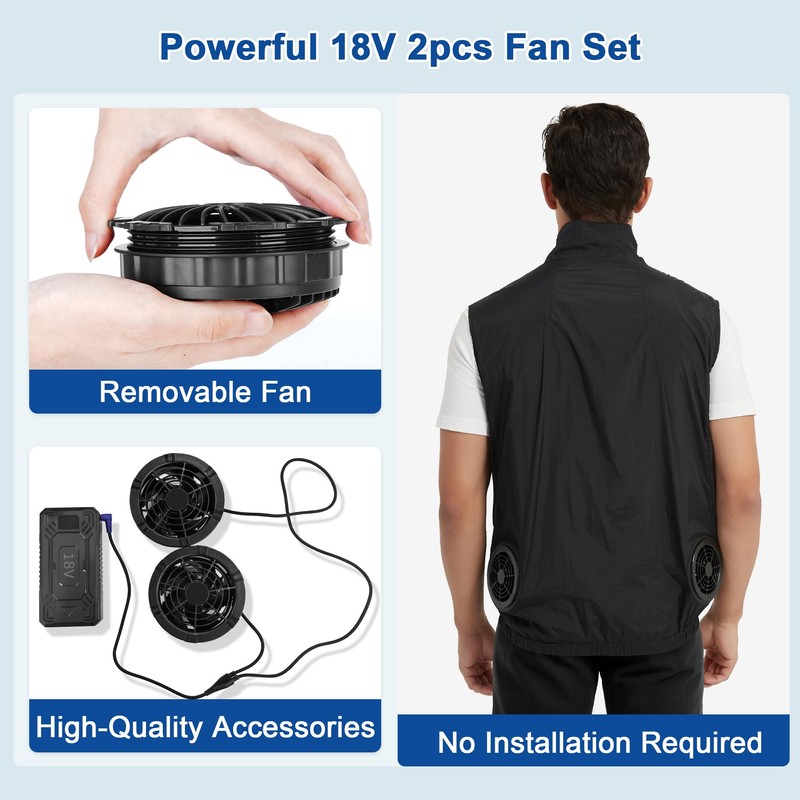 - EASY TO USE & WARRANTY: No installation needed, the Cooling Vest with 2-fan & 18V Battery Pack. Just connect the battery pack, long-press the battery button, and the fan starts. Removable fan: If you need to clean the vest, you need to remove the fan set from the clothes. One-year warranty, if you encounter any issues, simply contact us for prompt assistance.