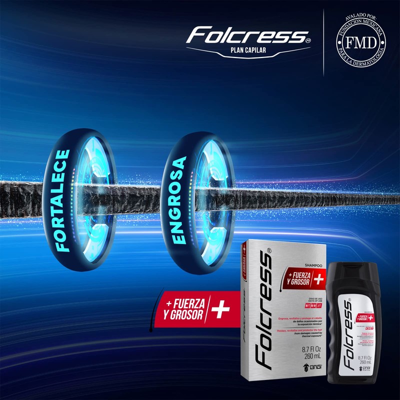 Folcress Shampoo+Strength And Thickness Advanced Formula Treatment 260ml (8.8oz.) FOLCRESS SHAMPOO + STRENGTH AND THICKNESS With Phospholipids and Dermosacaridos that helps give your hair greater strength and thickness, restoring a healthy appearance Shampoo + Fuerza Y Grosor FOLCRESS SHAMPOO + FUERZA Y GROSOR Con Fosfolipidos Y Dermosacaridos que ayuda a darle a tu cabello mayor fuerza y grosor devolviendole la apariencia saludable