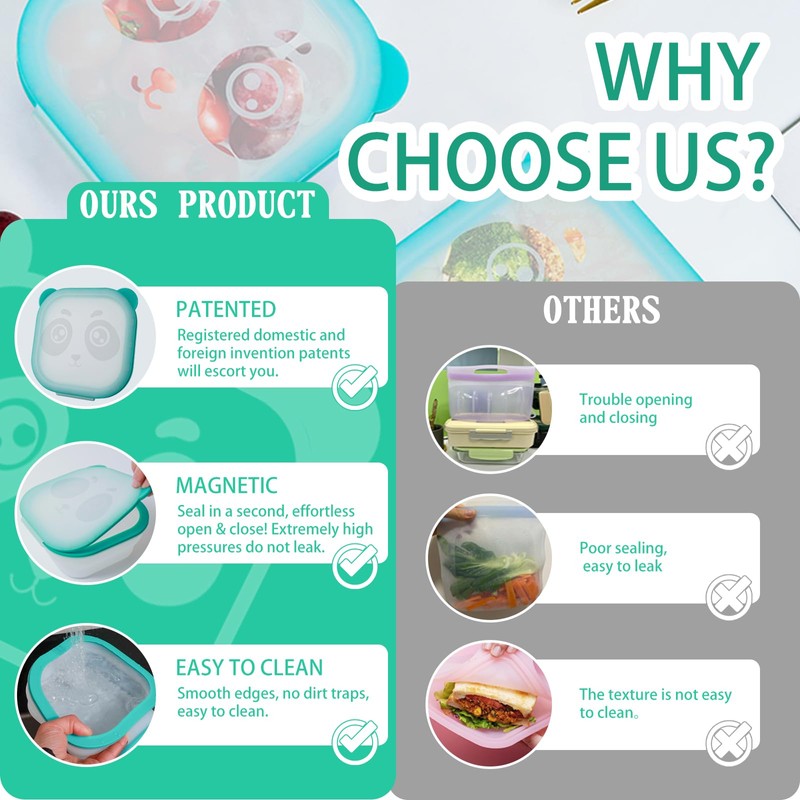 - Cooked food container with lid: Our magnetic silicone design makes cleaning a dream. It is no longer necessary to use a toothbrush to thoroughly clean the inside of a traditional food container. The magnetic storage box can completely clean the smooth inner wall of the magnetic storage container only by washing it with clear water. You can't forget the leak-proof cover, no matter where you go, you can safely carry our sealed container!