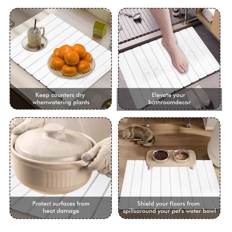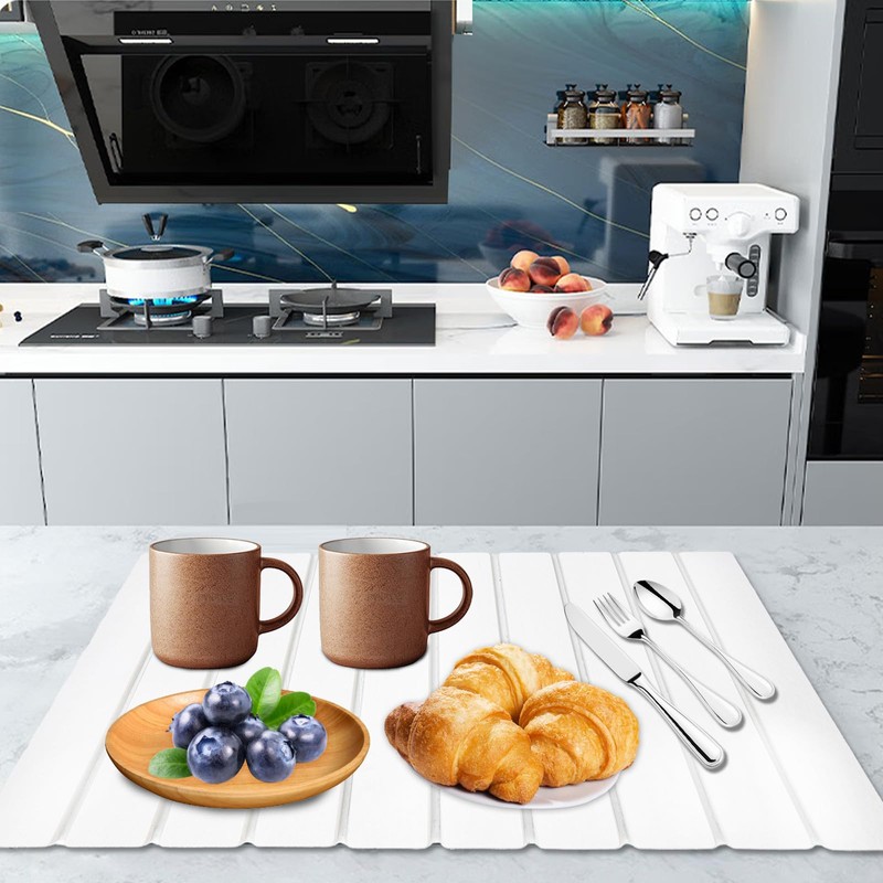 Foldable Diatomaceous Earth Dish Drying Mat, Quick Drying, Fast Water Absorption, Suitable for Cups, Dishes, Bottles, Kitchen Countertops, 24"(L) x 16"(W), White